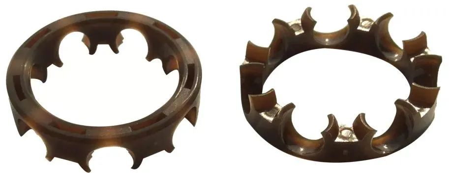 由于冠形塑料保持架(圖1)單邊開口,質(zhì)心偏離(不可避免)鋼球運(yùn)轉(zhuǎn)中心橫截面。高速運(yùn)轉(zhuǎn)時,由于離心力、接觸角等的變化,鋼球和滾道之間會產(chǎn)生差動、自旋、陀螺等復(fù)雜運(yùn)動,這些運(yùn)動勢必會對保持架造成劇烈的碰撞,加劇保持架的磨損、發(fā)熱及變形。一方面,這些運(yùn)動會對保持架兜孔底部產(chǎn)生高頻擺動扭曲,再加之保持架兜孔底部相對較薄弱(軸承內(nèi)部空間所限)和高溫時材料變軟的影響,可能造成保持架兜孔底部的斷裂。另一方面,由于這種質(zhì)心的不對稱和差動滑動、自旋滑動、陀螺滑動等導(dǎo)致的高溫,以及長期處于電機(jī)的高溫運(yùn)行環(huán)境中,可能導(dǎo)致保持架爪口變軟、變形;高速運(yùn)轉(zhuǎn)時,保持架有向底部方向(爪口的反方向)頂出的趨勢,速度越高、產(chǎn)生的溫升越高,這種風(fēng)險越大,可能導(dǎo)致保持架失去引導(dǎo)而致使軸承失效。