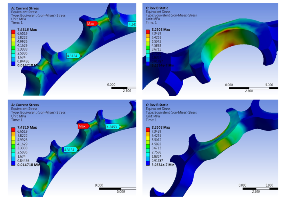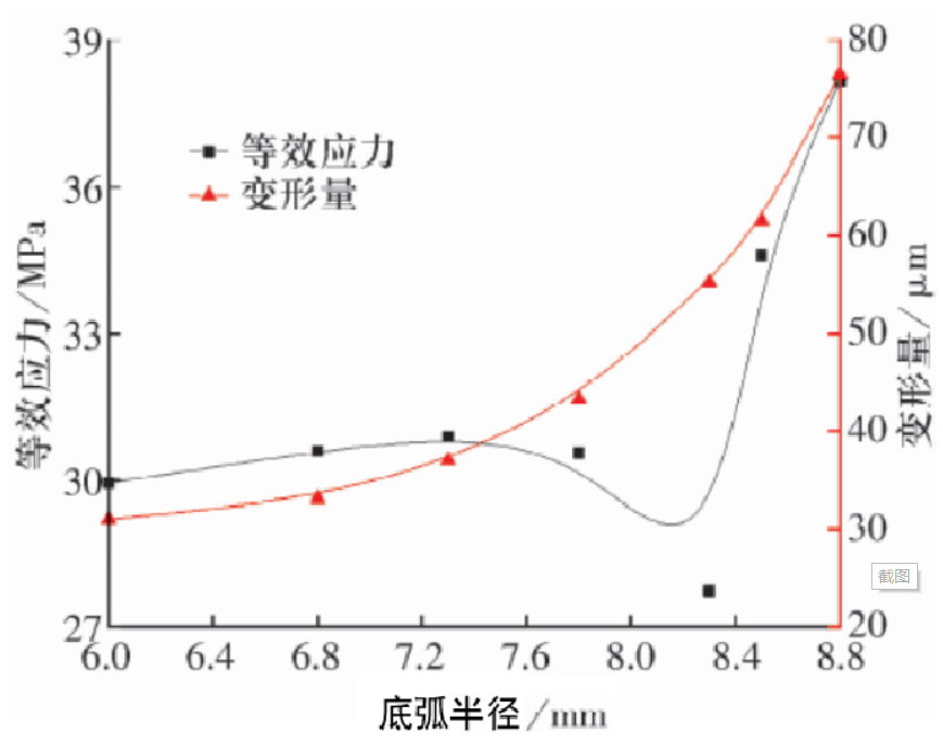 隨著底弧半徑的增大,保持架等效應(yīng)力呈先減小后增大的趨勢,變形量不斷增加。底弧的設(shè)計改變了保持架剛度,提高了保持架柔性,受載荷沖擊時,產(chǎn)生較大變形,使保持架等效應(yīng)力減小。當(dāng)?shù)谆“霃竭^大時,保持架柔性增大,但去除材料較多,導(dǎo)致相鄰結(jié)構(gòu)壁厚薄弱,保持架等效應(yīng)力增大。