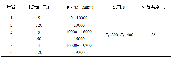 高變速性能試驗結(jié)果見表3,連續(xù)運(yùn)行時間3150s(52.5min),10個循環(huán),軸承及保持架完好。