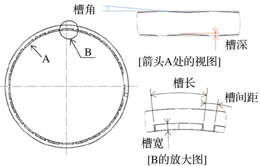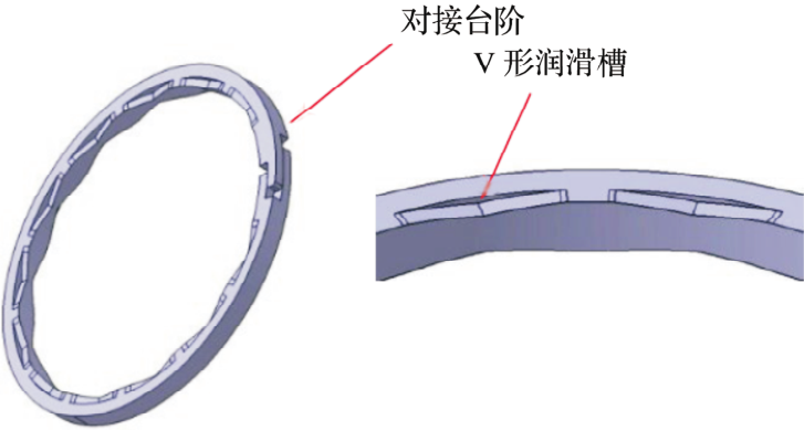 通過(guò)在軸槽側(cè)壁上滑動(dòng)的密封圈表面設(shè)置V形潤(rùn)滑槽,實(shí)現(xiàn)低摩擦力矩密封圈的低摩擦力矩和低漏油。密封圈采用在 PEEK樹(shù)脂中加入特殊添加劑制成的 BEAREEPK5301材料,側(cè)面有注塑成型的V形潤(rùn)滑槽,且對(duì)接臺(tái)階形狀復(fù)雜。通過(guò)對(duì)接臺(tái)階的復(fù)雜形狀減少對(duì)接臺(tái)階處的漏油。