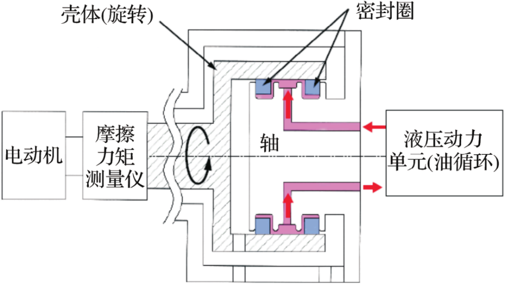 具有不同潤(rùn)滑槽形狀和無(wú)潤(rùn)滑槽的3種密封圈對(duì)比見(jiàn)表1。試驗(yàn)設(shè)備示意圖如圖3所示。通過(guò)安裝在軸槽上的2個(gè)密封圈之間的循環(huán)油施加油壓并旋轉(zhuǎn)殼體,從而實(shí)現(xiàn)摩擦力矩的測(cè)量。