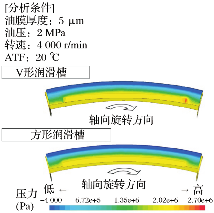 1個(gè)潤(rùn)滑槽流體區(qū)域模型的分析結(jié)果如圖5所示。采用V形潤(rùn)滑槽時(shí),由于流體動(dòng)力效應(yīng),潤(rùn)滑槽一端的油膜壓力高。油膜壓力產(chǎn)生的軸向力與通過(guò)油壓將密封圈壓在軸槽側(cè)壁上的力方向相反,因此可減小油壓。還假設(shè)由于壓力差,油從潤(rùn)滑槽端部流到潤(rùn)滑槽之間的滑動(dòng)表面,有助于降低摩擦力矩。另一方面,在V形潤(rùn)滑槽中觀察到的高油膜壓力在方形潤(rùn)滑槽中觀察不到。