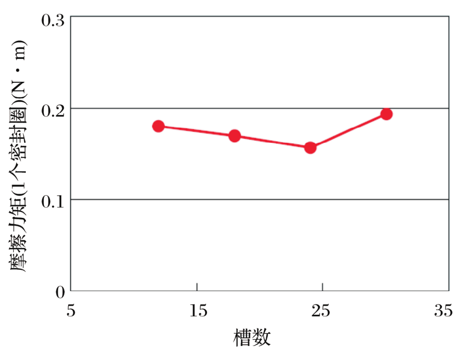 槽數(shù)與摩擦力矩的關(guān)系如圖8所示。槽數(shù)由12向24增加時(shí),摩擦力矩逐漸降低,但槽數(shù)為30時(shí),摩擦力矩增大。測(cè)量結(jié)果與前述觀點(diǎn)一致,證明槽數(shù)存在最優(yōu)值。由于槽數(shù)受到設(shè)計(jì)和制造的限制,從而取決于外徑,因此,NTN低摩擦力矩密封圈按照外徑尺寸排列了最優(yōu)數(shù)量的V形潤(rùn)滑槽。