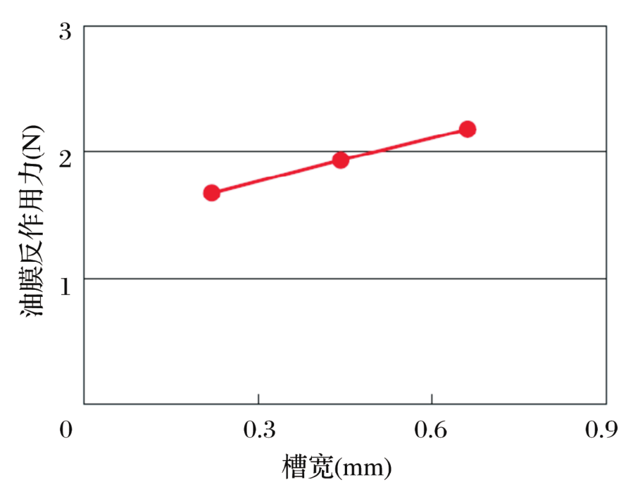 槽寬與油膜反作用力的關(guān)系如圖9所示。驗(yàn)證結(jié)果與估算結(jié)果一致,油膜反作用力隨著槽寬增加而增大,但過(guò)大的槽寬會(huì)導(dǎo)致漏油量增大。因此,必須針對(duì)每種情況確定槽寬,要考慮軸和殼體的尺寸、偏心率、密封圈和殼體的磨損量等。