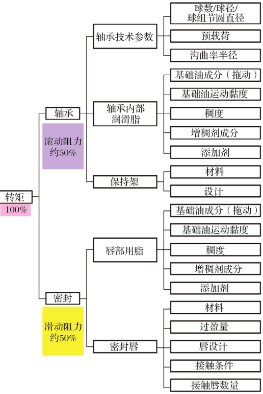 輪轂軸承的轉矩由軸承的滾動阻力和密封(外部密封和內(nèi)部密封)的滑動阻力組成,各占約50%。影響輪轂軸承轉矩的各種因素如圖2所示,各種減摩技術包括:優(yōu)化軸承結構參數(shù)、改進軸承內(nèi)部潤滑脂來減少滾動阻力;改進密封橡膠材料、優(yōu)化密封結構和密封過盈量來減少滑動阻力。