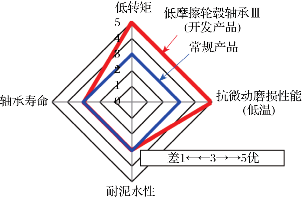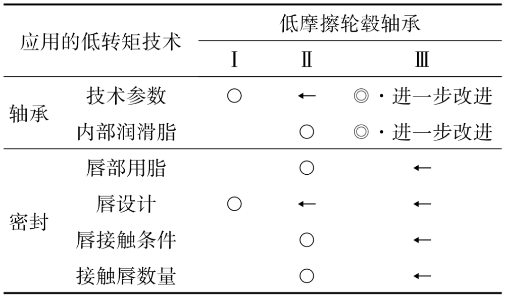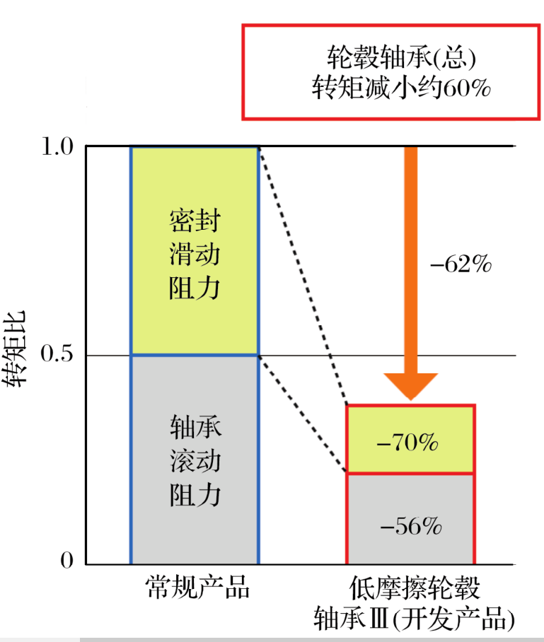 與常規(guī)產(chǎn)品相比,新開發(fā)的低摩擦輪轂軸承Ⅲ的轉矩減小了62%。通過應用之前開發(fā)的技術參數(shù)和新開發(fā)的潤滑脂(改進了低摩擦輪轂軸承Ⅱ的內(nèi)部潤滑脂)來實現(xiàn)轉矩的減小。