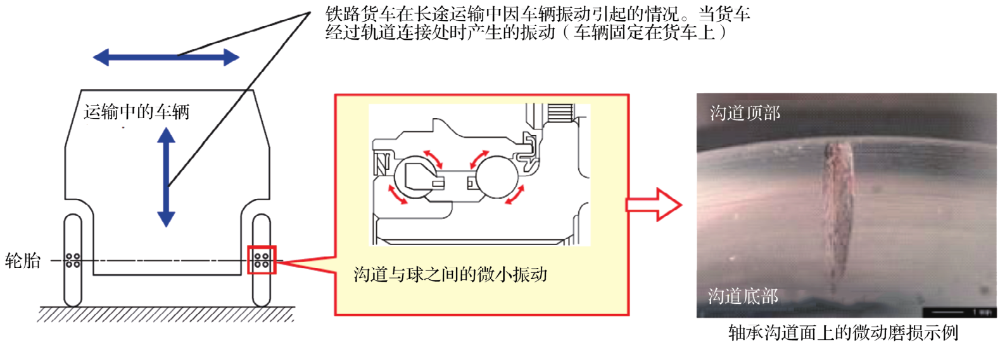 新制造的車輛在鐵路貨車上進行長途運輸時,輪轂軸承的溝道與球之間會產(chǎn)生微小振動。如圖4中的箭頭所示,振動會擠壓出溝道與球之間的潤滑脂,產(chǎn)生金屬與金屬接觸,導致微動磨損。在潤滑脂趨于變硬和流動性降低的低溫條件下,微動磨損更明顯。在這種情況下駕駛車輛可能會產(chǎn)生異常聲。