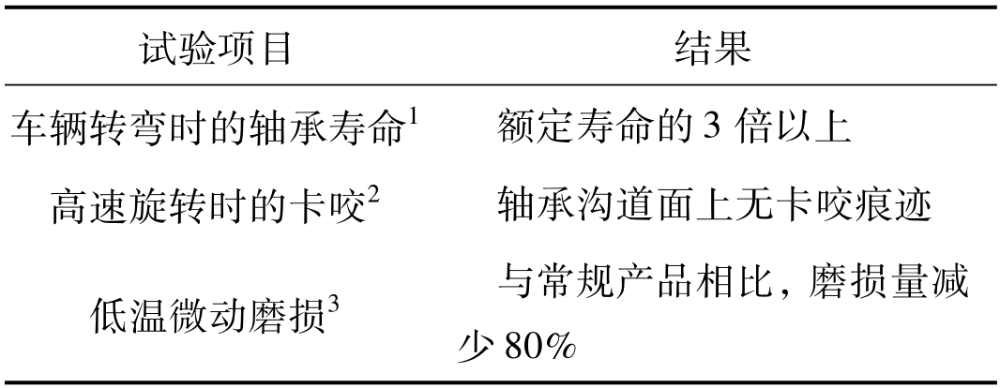 還進行了可靠性評價試驗,以驗證所需的功能,見表3。填充新潤滑脂的軸承滿足了試驗項目的所有開發(fā)目標,實現(xiàn)了軸承內(nèi)部潤滑脂所要求的所有功能。