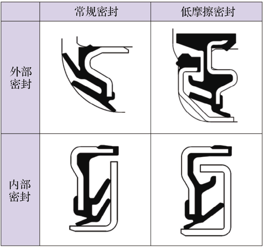 第3代輪轂軸承常規(guī)密封和低摩擦密封采用的外部密封和內(nèi)部密封的結構對比如圖6所示。