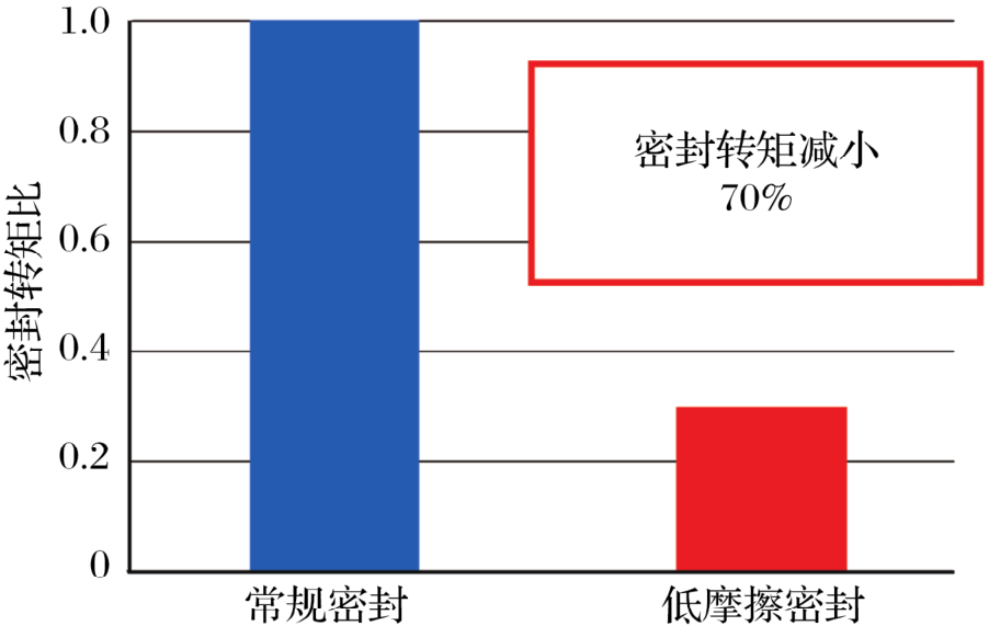 減小摩擦不僅是由于結構,還由于具有低摩擦因數(shù)的橡膠材料、唇接觸表面的優(yōu)化設計和唇部用脂。與常規(guī)產(chǎn)品相比,這些產(chǎn)品的密封轉矩減小了70%,如圖7所示。