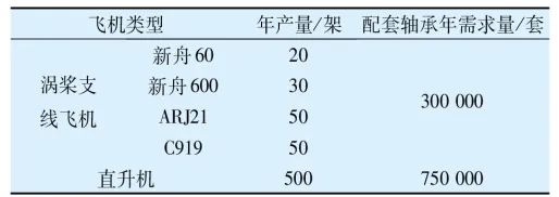 我國(guó)民用飛機(jī)年產(chǎn)量及相應(yīng)的配套軸承需求量見表2,其中按每架飛機(jī)需配套軸承2 000套(發(fā)動(dòng)機(jī)軸承900套)計(jì)算,每架直升機(jī)需配套軼承1 500套計(jì)算。