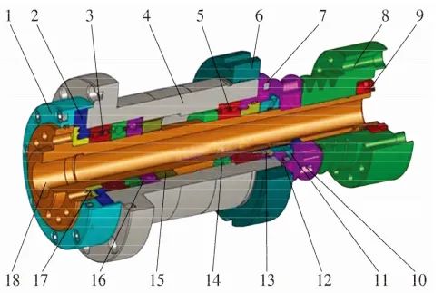 1-護(hù)套;2-前壓緊環(huán);3-前軸承;4-軸承座;5-后軸承;6-后鎖緊螺母;7-后端蓋;8-驅(qū)動(dòng)帶輪;9-帶輪鎖緊螺母;10-編碼器帶輪;11-后緊定螺母;12-后壓蓋;13-后壓緊環(huán);14-后調(diào)整環(huán);15-前緊定螺母;16-角接觸軸承組;17-前調(diào)整環(huán);18-主軸。
