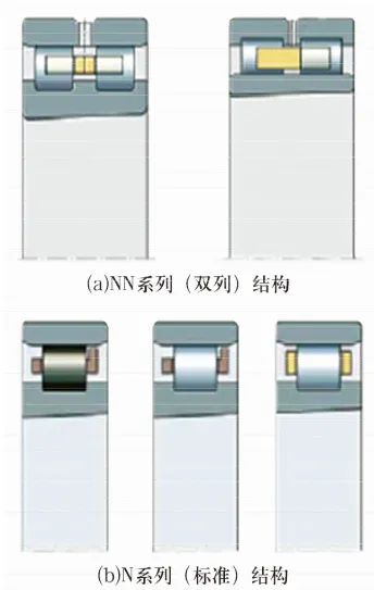 成對(duì)組配或多聯(lián)組配角接觸球軸承如圖8所示,在應(yīng)用安裝時(shí)必須施加一定的預(yù)載荷。選擇適當(dāng)?shù)念A(yù)載荷可以提高主軸系統(tǒng)剛性,降低溫升,改善系統(tǒng)加工精度。軸承預(yù)載荷通常分為輕(A)、中(B)、重(C)3檔,用戶可根據(jù)主軸系統(tǒng)的實(shí)際工況進(jìn)行選擇。單、雙列圓柱滾子軸承的結(jié)構(gòu)如圖9所示。雙向推力角接觸球軸承如圖10所示,通常要求SP等級(jí)公差,有需要時(shí)也可要求UP等級(jí)公差。