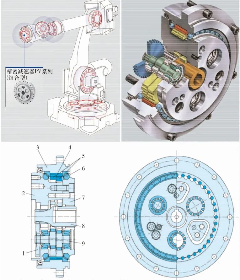 1-直齒輪;2-軸;3-外殼;4-針齒;5-RV齒輪;6-主軸承;7-支撐凸緣;8-輸入齒輪;9-曲柄軸。