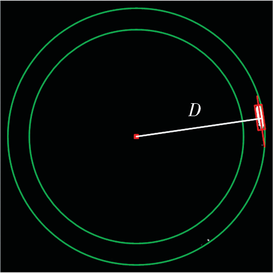 提取出缺陷后,計(jì)算該缺陷的區(qū)域面積S與區(qū)域輪廓長(zhǎng)度L,如果缺陷面積與輪廓長(zhǎng)度皆未超過(guò)設(shè)定閾值,則視為無(wú)此類(lèi)型缺陷轉(zhuǎn)而進(jìn)行下一缺陷的識(shí)別;否則進(jìn)一步計(jì)算最小外接矩形主軸至小圓圓心的距離,由于車(chē)廢細(xì)化后呈圓弧形,故圓心至主軸的距離會(huì)大于小圓半徑,所以將小圓半徑設(shè)為距離閾值TD,若距離D超過(guò)閾值TD,則將此套圈判定為車(chē)廢缺陷。