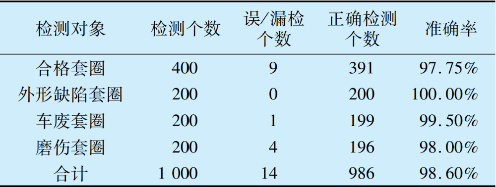 另外,對(duì)不同型號(hào)的套圈也進(jìn)行了多次檢測(cè),識(shí)別準(zhǔn)確率較高,誤漏檢率較低,響應(yīng)時(shí)間較短,并能實(shí)時(shí)統(tǒng)計(jì)被檢測(cè)套圈的型號(hào)、數(shù)量、合格率、缺陷種類(lèi)等數(shù)據(jù),滿(mǎn)足企業(yè)生產(chǎn)在線檢測(cè)要求,可以替代人工實(shí)現(xiàn)檢測(cè)。