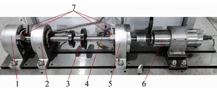 1—非驅(qū)動端徑向磁軸承;2—激勵磁軸承;3—盤片;4—轉(zhuǎn)軸;5—驅(qū)動端徑向磁軸承;6—電動機;7—位移傳感器。