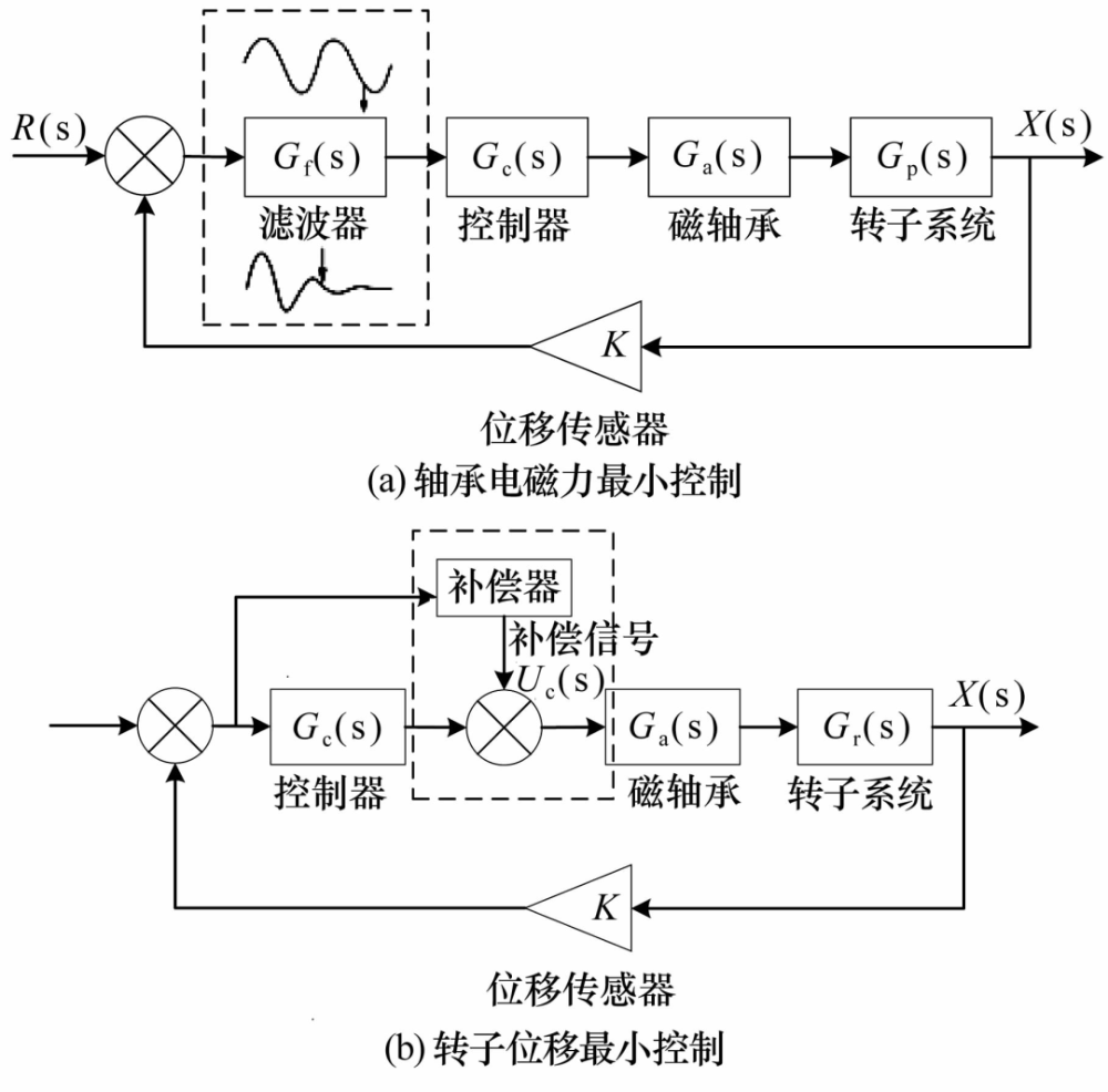 目前,磁懸浮轉(zhuǎn)子不平衡振動控制策略有軸承電磁力最小控制和轉(zhuǎn)子位移最小控制這2種。