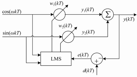 20世紀80年代,自適應(yīng)濾波算法獲得蓬勃發(fā)展,起初在噪聲消除方面應(yīng)用廣泛。LMS算法由于原理簡單,自適應(yīng)、抗干擾能力強,收斂性好等優(yōu)點獲得了廣泛應(yīng)用,并于20世紀90年代應(yīng)用于磁懸浮轉(zhuǎn)子不平衡振動控制領(lǐng)域。LMS算法實際上是一種離散自適應(yīng)陷波器,其原理如圖5所示。文獻[14]在2009年提出了基于LMS算法的實時變頻切換控制策略,降低了周期性不平衡激振力;隨后,為兼顧穩(wěn)定性和收斂速度,提出了變步長LMS算法并在不同定轉(zhuǎn)速試驗中取得了較好效果,而將H∞算法與自適應(yīng)步長LMS算法相結(jié)合實現(xiàn)實時最小慣性力補償,則提高了整個系統(tǒng)的魯棒穩(wěn)定性和抗干擾性能。另外,文獻[17]提出了一種基于LMS算法的自適應(yīng)前饋補償,抵消了功放低通特性的影響,其方法原理如圖6所示。