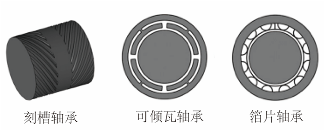 兩相對(duì)運(yùn)動(dòng)表面形成一定收斂間隙,運(yùn)動(dòng)表面的高速移動(dòng)將具有黏滯性的氣體帶入楔形間隙產(chǎn)生壓力升,進(jìn)而產(chǎn)生作用于轉(zhuǎn)子的承載力,承載力的大小隨轉(zhuǎn)速的增加而增加。楔形間隙、潤(rùn)滑氣膜厚度及氣體的黏滯性是形成動(dòng)壓效應(yīng)的關(guān)鍵條件。由于擺脫了對(duì)氣源供氣系統(tǒng)的依賴,使得氣體動(dòng)壓軸承結(jié)構(gòu)簡(jiǎn)單、成本降低。但是,在啟停階段轉(zhuǎn)速較低、動(dòng)壓效應(yīng)較弱時(shí),不足以產(chǎn)生作用于轉(zhuǎn)子的支撐力,導(dǎo)致轉(zhuǎn)子與軸承內(nèi)壁接觸,產(chǎn)生嚴(yán)重的摩擦磨損,直接影響軸承的壽命。此外,氣體動(dòng)壓軸承還存在阻尼特性差,轉(zhuǎn)子過(guò)臨界難的問(wèn)題。針對(duì)以上問(wèn)題,研究者通過(guò)開發(fā)耐磨涂層或設(shè)計(jì)不同結(jié)構(gòu)形式的軸承來(lái)解決此問(wèn)題。其中比較有代表性的氣體動(dòng)壓軸承結(jié)構(gòu)形式有刻槽氣體動(dòng)壓軸承、可傾瓦氣體動(dòng)壓軸承、箔片氣體動(dòng)壓軸承,如圖4所示。
