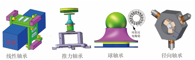 當(dāng)前,對(duì)于擠壓膜氣體軸承的研究主要集中在潤(rùn)滑機(jī)理分析和軸承結(jié)構(gòu)改進(jìn)上。對(duì)于潤(rùn)滑機(jī)理的研究主要從兩種理論進(jìn)行分析,分別是聲輻射理論和流體潤(rùn)滑理論。由于流體潤(rùn)滑理論便于分析轉(zhuǎn)速對(duì)擠壓膜氣體軸承特性的影響,因此,被大多數(shù)研究者采用。對(duì)于擠壓膜氣體軸承結(jié)構(gòu)的改進(jìn)上,研究者分別提出了擠壓膜氣體線性軸承、擠壓膜氣體推力軸承、擠壓膜氣體球軸承、擠壓膜氣體徑向軸承,如圖6所示。