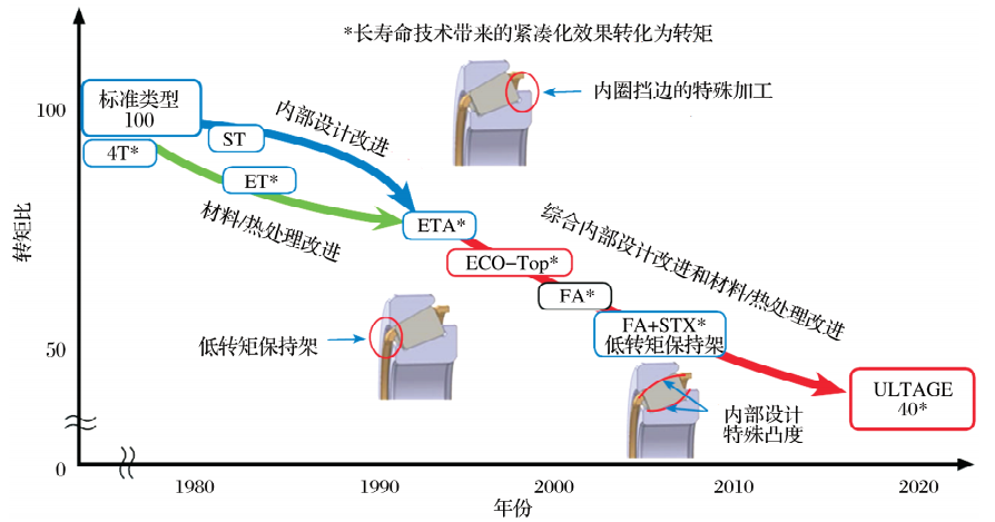 不同類型深溝球軸承的結(jié)構(gòu)和性能特點見表1。通過比較轉(zhuǎn)矩,自20世紀80 年代以來深溝球軸承的技術(shù)史如圖2所示。